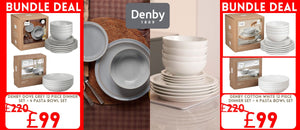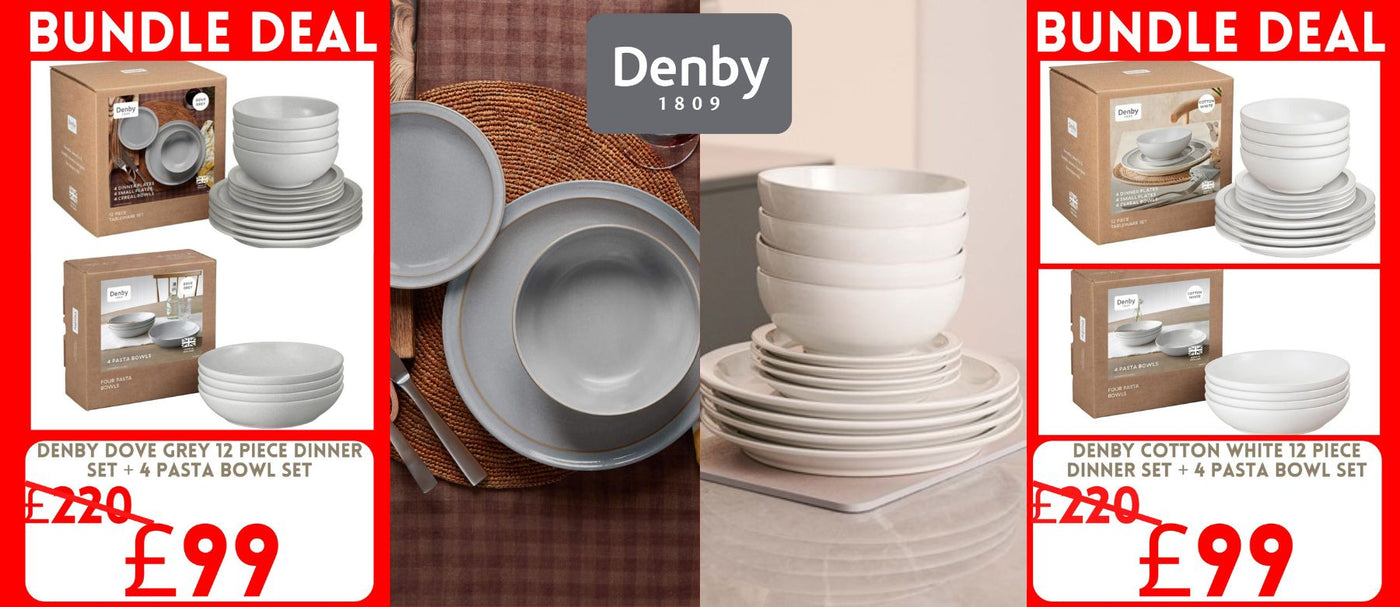 Bundle Deal Denby Cotton White 12 Piece Tableware Set & 4 Piece Pasta Bowl Set