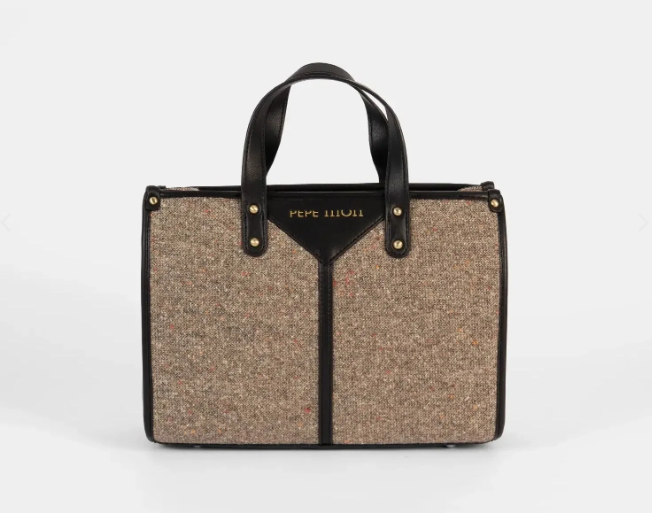 - Mixed textures (tweed textile with faux-leather trims) for a refined finish.