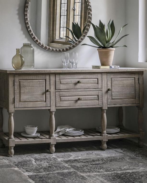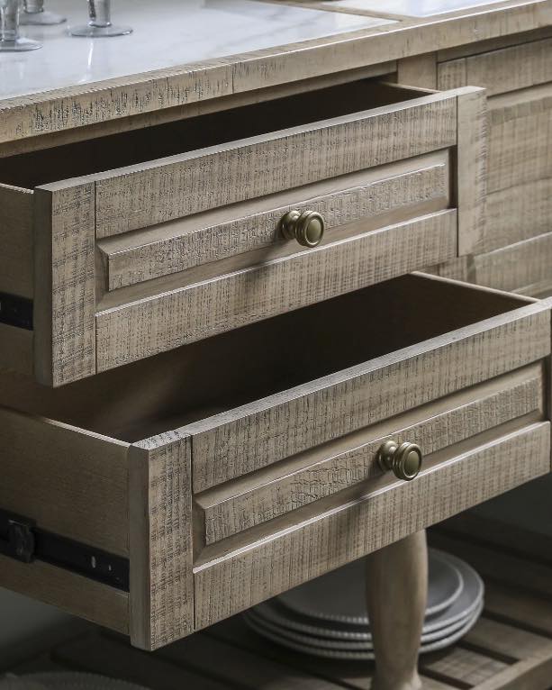 Offering an updated classic look, this stunning sideboard features inset marble on the top along with two cupboards, two drawers and a large shelf to give practical storage combined with a stylish sophisticated yet rustic look. It is crafted from North American pine solids and veneers where practical, with the clever use of a mill saw giving characteristic features of cross sawn timber to create a tactile, dramatic finish. Matching pieces are available.