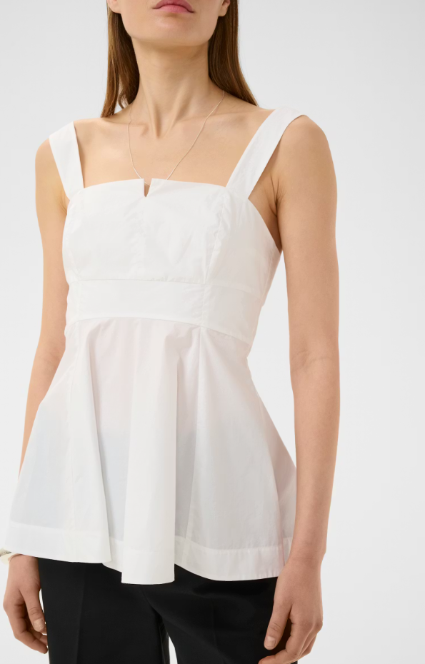 This sleeveless top stands out with its structured fit, wide straps, and modern notched neckline. The subtly flared silhouette and soft-looking finish give it a confidently clean appeal.