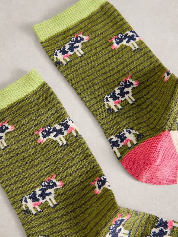 White Stuff Ladies Novelty Cow Ankle Sock in GREEN MULTI