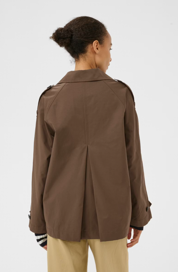 This short trench coat in a warm brown tone combines classic details with a relaxed silhouette. Featuring double-breasted buttons, shoulder epaulettes and a wide collar, it offers a timeless look. Wear it as a stylish extra layer on chilly days where comfort meets classic style.