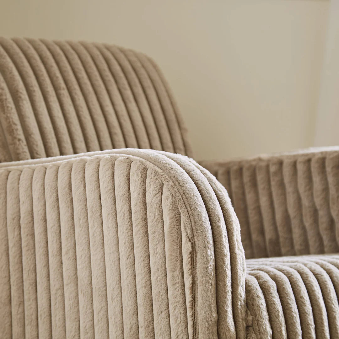 The Etta Nursing chair in Mink Faux Fur has a contemporary design that is the perfect match for the modern nursery. Etta has given the classic nursing chair an upgrade with its generous cord curves and neutral beige colour palette.