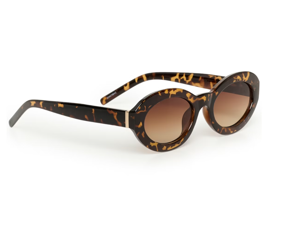 Sunglasses feature bold oval frames with a glossy finish and subtle pattern effect. Wide arms, curved bridge, and softly tinted lenses add modern edge.