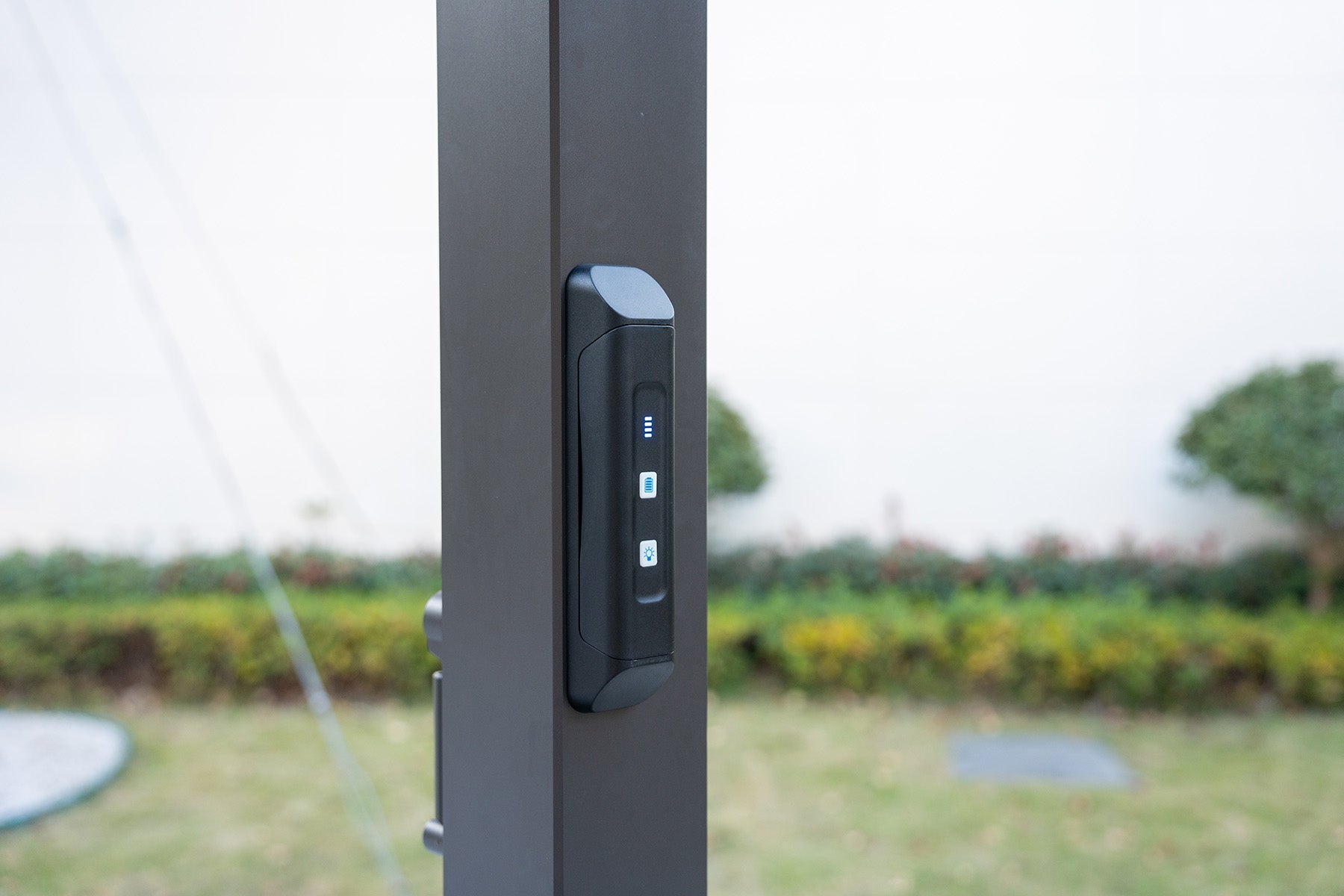 • Convenient crank handle to open and close louvered panels on one of the upright posts that angles the louvers to provide optimum shade from the sun and rain.