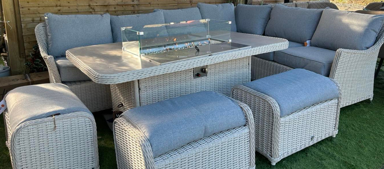 Relax in style on those summer evenings with the new Antigua corner set with a stunning rectangular fire pit table.