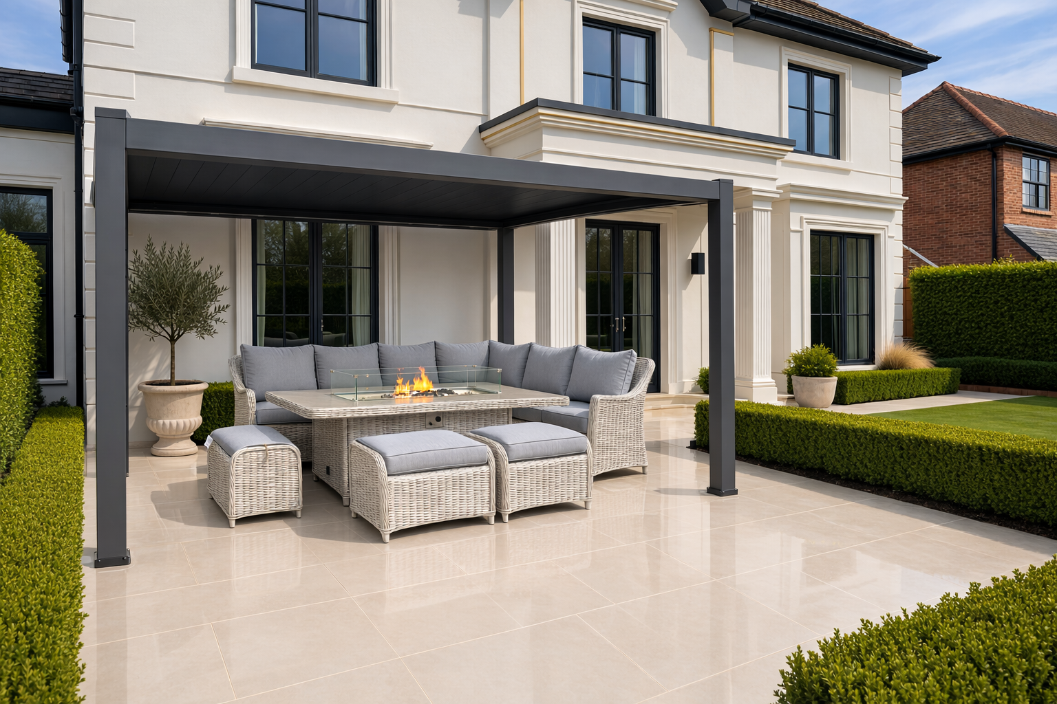 Antigua Large 10 Seater Modular Rectangular Fire Pit Set AND Hartman Premium Como 4m x 3m Pergola