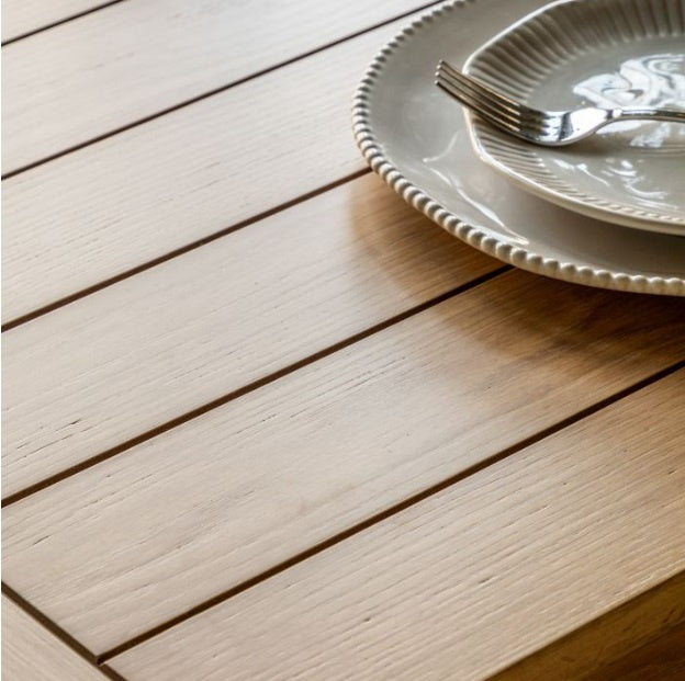 Offering farmhouse charm, this extending dining table is the perfect addition to any interior. Featuring solid oak underframe, turned spindle legs and a grooved & planked oak top that gives a traditional and rustic feel. Thanks to the easy to use metal extension pull table leaf, the table can easily be extended to seat up to 10 people. Due to the handmade nature of this product colour variations may be present.