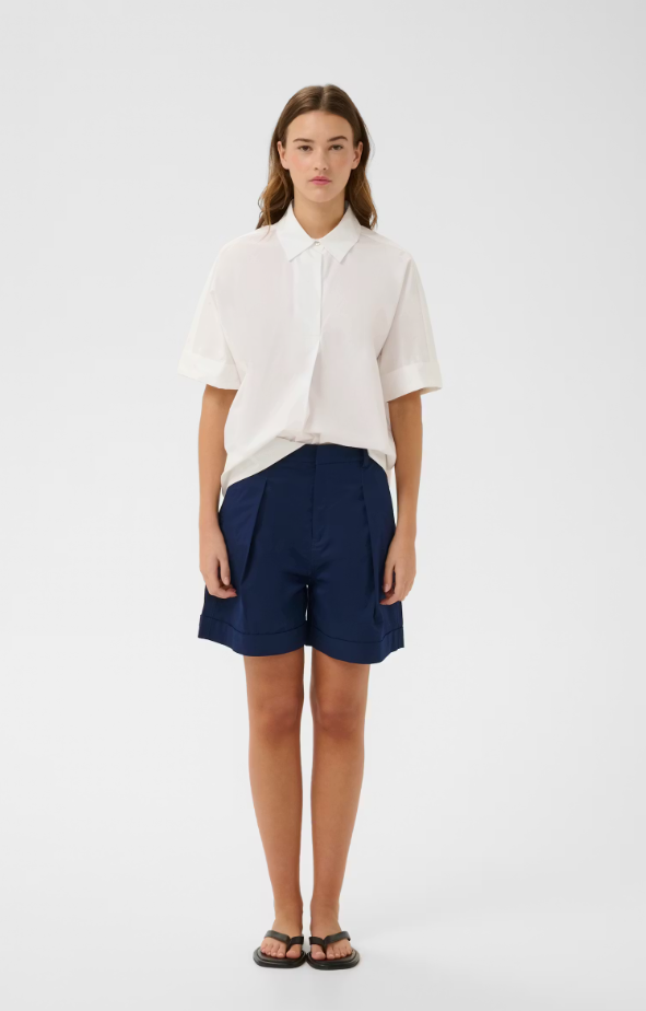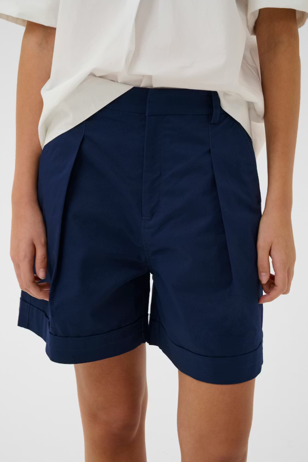 Tailored shorts feature a straight-leg cut, mid-thigh length, belt loops, sharp front pleats, and turned-up hems for an elevated yet relaxed silhouette.