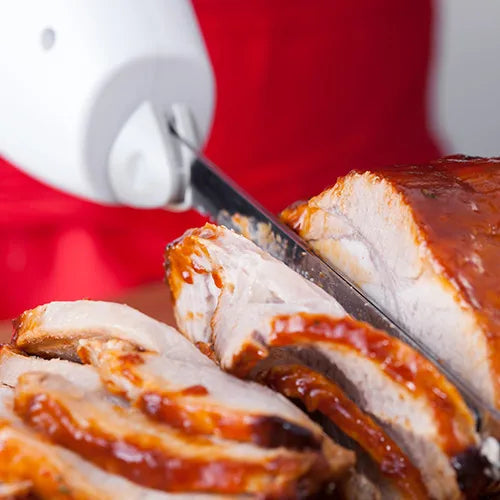 The ergonomic handle offers a safe and comfortable grip and the carving knife is simple to operate thanks to its thumb tip power button and blade release.