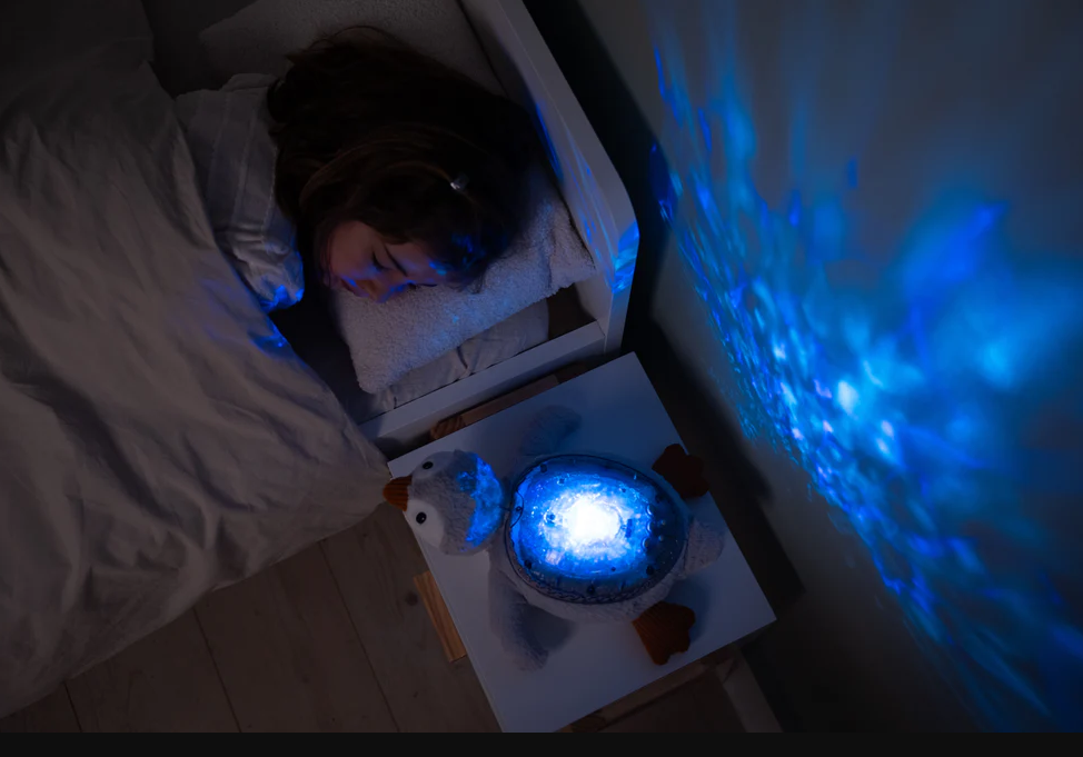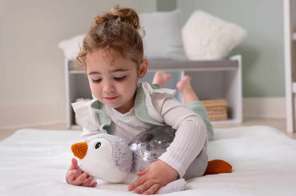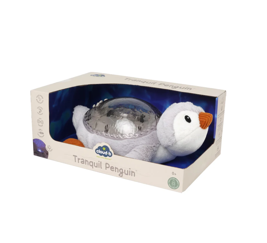 Tranquil Penguin™ is a cute musical nightlight that glows with a soft light and projects polar underwater light effect on the bedroom ceiling, thanks to a unique patented mechanism. Tranquil Penguin™ musical nightlight soothes baby and reassures children who are afraid of the dark. A soft plush during the day, it transforms into a nightlight at night. The moving color projection in two colors creates a magical polar light effect. Melodies and white noises will soothe the little ones to help carry them away to dreamland. It has 4 soothing sounds: underwater melody, Tranquil melody, whale song, ocean waves and 6 adjustable volume levels. An intelligent Cry Sensor, with adjustable sensitivity, restarts at baby's first cry. The brightness of the projection can be adjusted to suit different environments. The 23-minute timer ensures complete darkness and silence while your child sleeps soundly. The battery is recharged using a USB-C cable. Tranquil Penguin™ nightlight is made of 100% recycled padding and stuffing from plastic bottles, with GRS certification, and comes in a FSC certified packaging, which contributes to biodiversity sustainability. Tranquil Penguin™ is an eco-responsible and environmentally friendly plush toy.