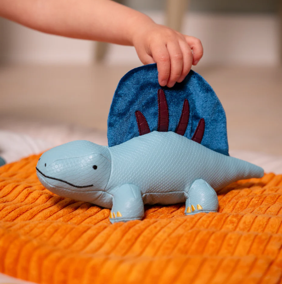 Dimitri the Dimetrodon is a brightly colored dinosaur who will brighten any child's day. Made from vegan leather, Dimitri features a bell that emits soft tinkling sounds with every movement. The textured material of his blue body and smooth belly, and the crisp dark blue fabric of his crest, will awaken the curiosity of young explorers. Dimitri and his friends are perfect for decorating a child's bedroom and will stay with them for a long time. The Dino Friends are companions for play, discovery and adventure, each with their own unique personality. Get ready to plunge into the world of dinosaurs with Dimitri and his friends from the volcanic lands. Adopt them and collect them all!