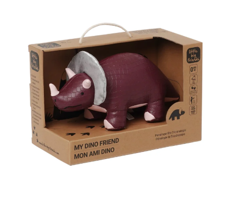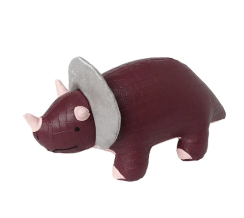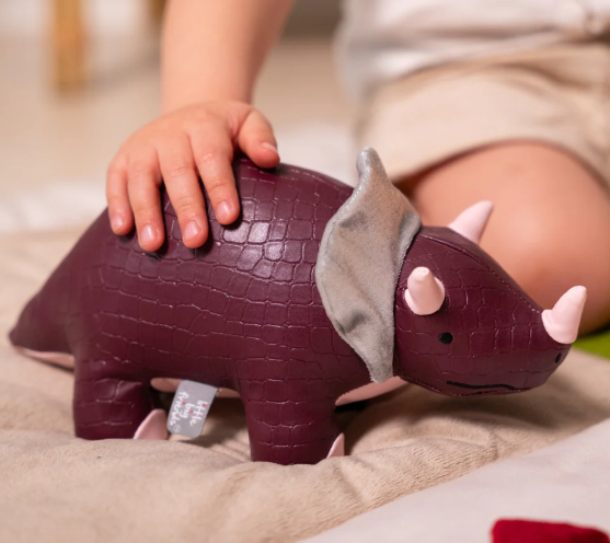Penelope the Triceratops is an adorable, brightly-colored dinosaur who will brighten any child's day. Made from vegan leather, Penelope features a bell that tinkles softly with every movement.