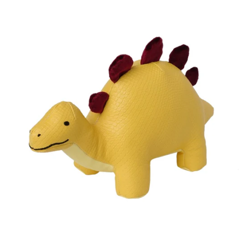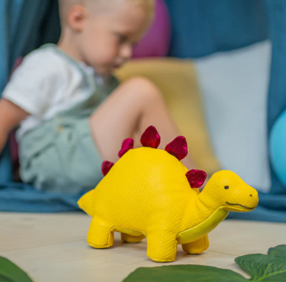 Steffy the Stegosaurus is an adorable, brightly-colored dinosaur who will brighten any child's day. Made from vegan leather, Steffy is equipped with a bell that tinkles softly with every movement.