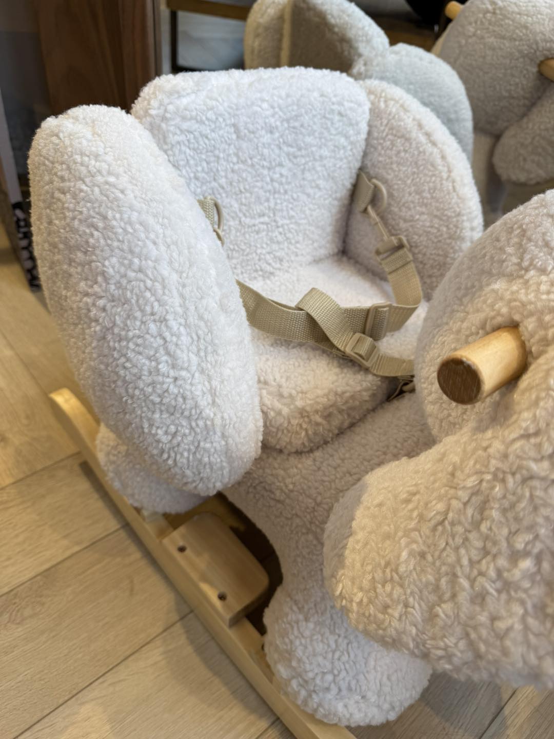 • Designed for safe rocking: wide wooden base with footrests, including a safety belt, soft padded seat with side supports, and handles for small hands