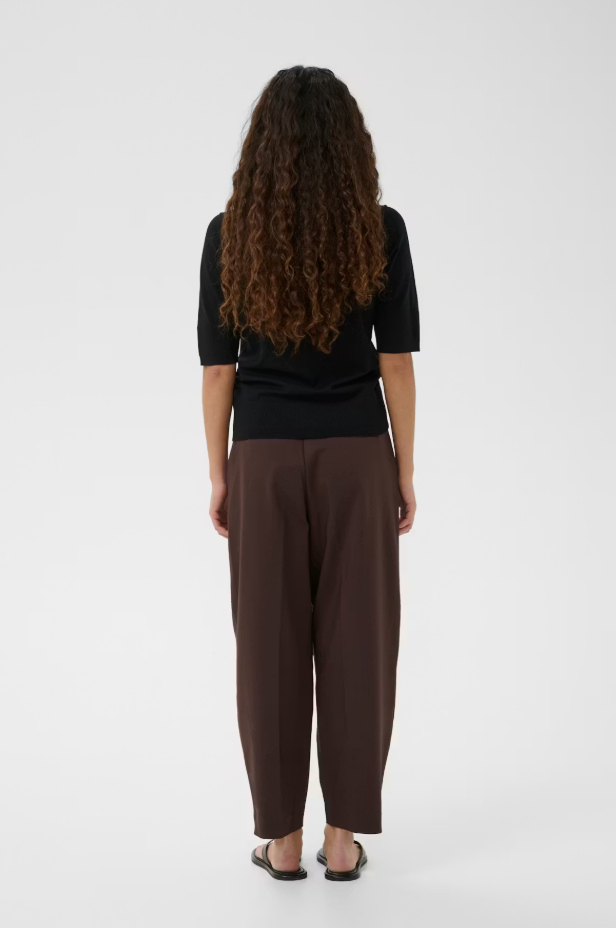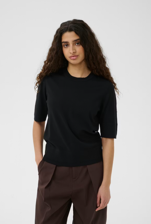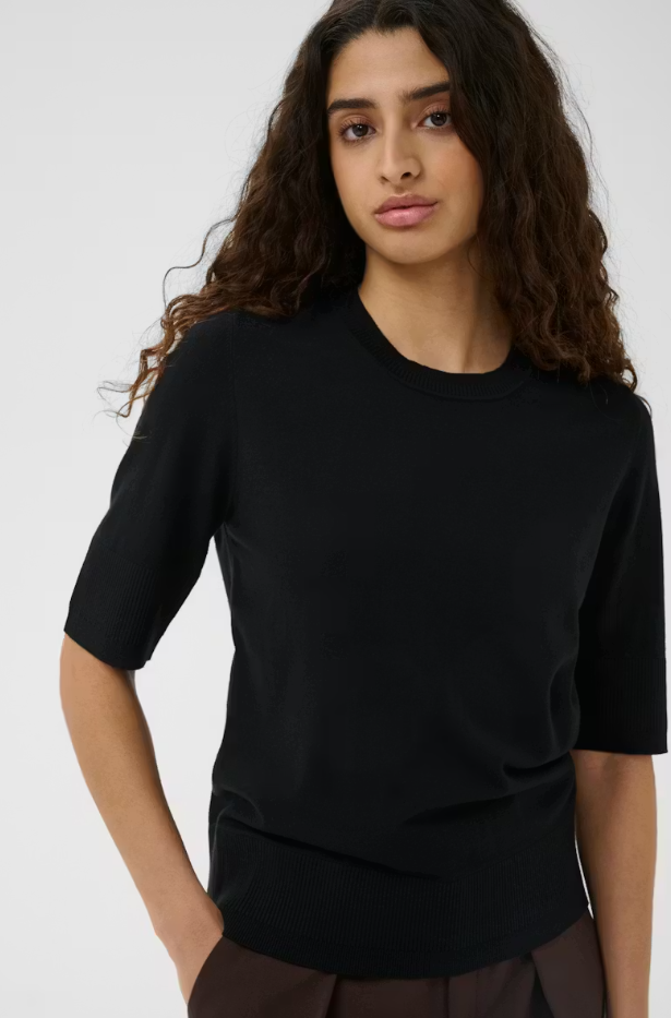 Short sleeve knit top with a classic crew neck and straight fit. Features ribbed trims at the neckline, sleeves, and hem for a refined finish. Minimalist silhouette offers timeless appeal.