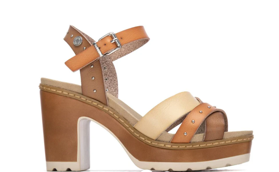 Refresh heeled sandal. Made from a leather-like material. The upper features crisscrossing straps adorned with small metal studs, and an adjustable ankle strap with a buckle. Its wide heel and lug sole offer greater stability and comfort. Perfect for adding personality to all your looks. This style has received vegan certification from PETA (Animal Rights Organization).