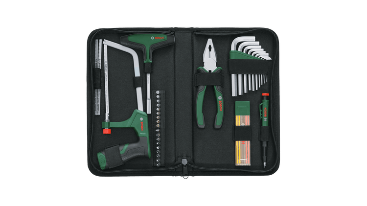 - Including a 150 mm hacksaw, a bit screwdriver with T-handle, 180 mm combination pliers, a deep hole marker pencil, a 10-piece hex key set, 18x colour-coded screwdriver bits, 2x hacksaw blades and 6x multicolour leads
