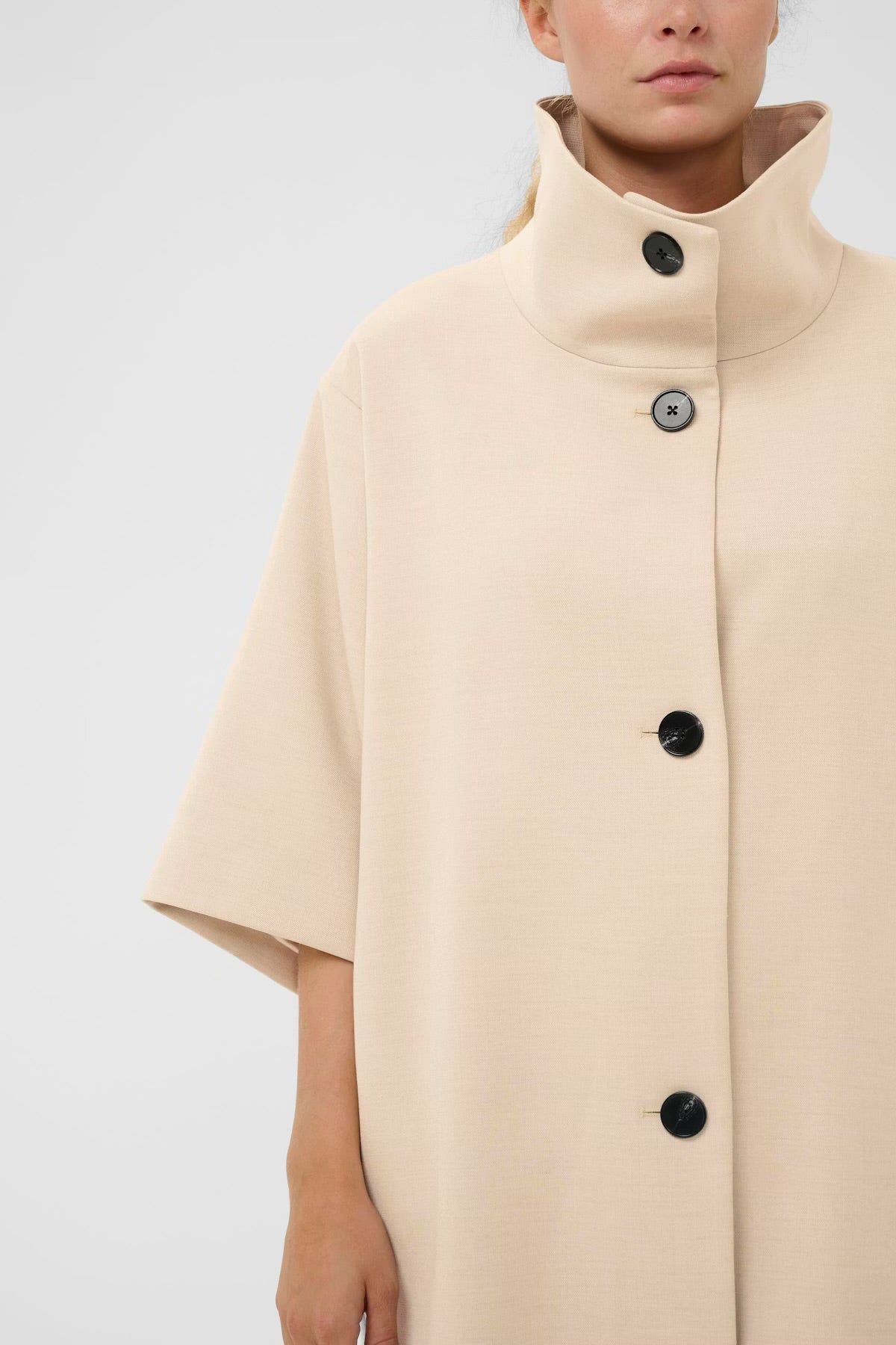 Minimalist jacket with a structured high stand collar, oversized straight silhouette and wide half sleeves. Features four large buttons for closure and a smooth, soft finish ideal for clean, contemporary style.