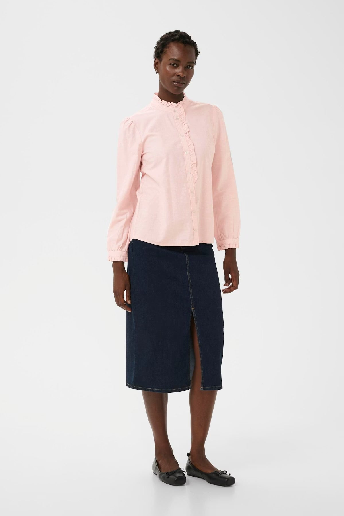 The model is 180 cm tall and wears a size 36. This soft pink shirt is made from a comfortable cotton fabric and features delicate ruffle details along the button placket and a high collar that adds a romantic touch. The sleeves are finished with elasticated cuffs. Style it with jeans or a skirt for a relaxed yet feminine look.