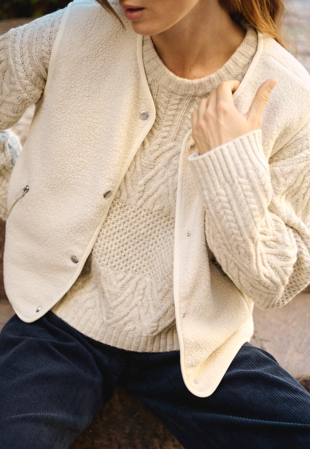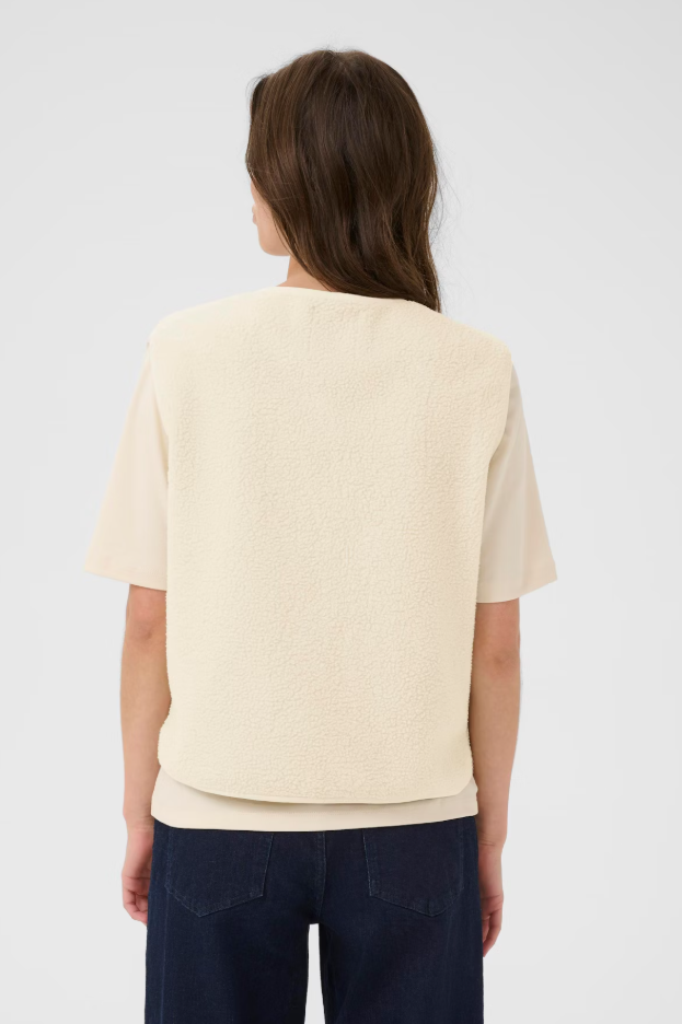 This soft teddy fleece vest features snap buttons and zipped front pockets. With its slightly boxy fit, it's ideal for layering over a tee or under a jacket during transitional seasons.