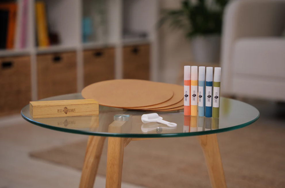 Family Colors allows 5 family members to each make their own print on an individual plexiglass panel and then combine them into a colorful, layered display. Each kit includes 5 transparent panels, 1 pretty wooden base for support, 5 paint tubes, 1 roller for application, and instructions to easily create the prints. Family Colors offers a modern and original way to display family unity and love through a unique interior decoration.