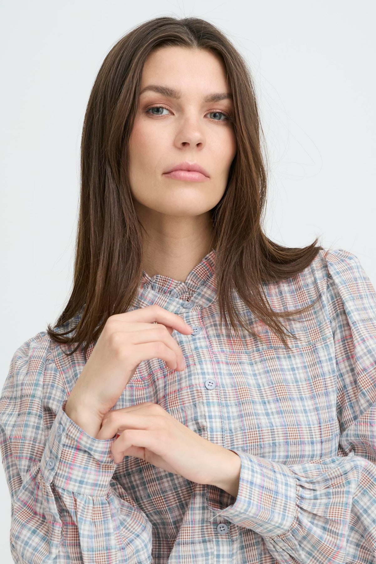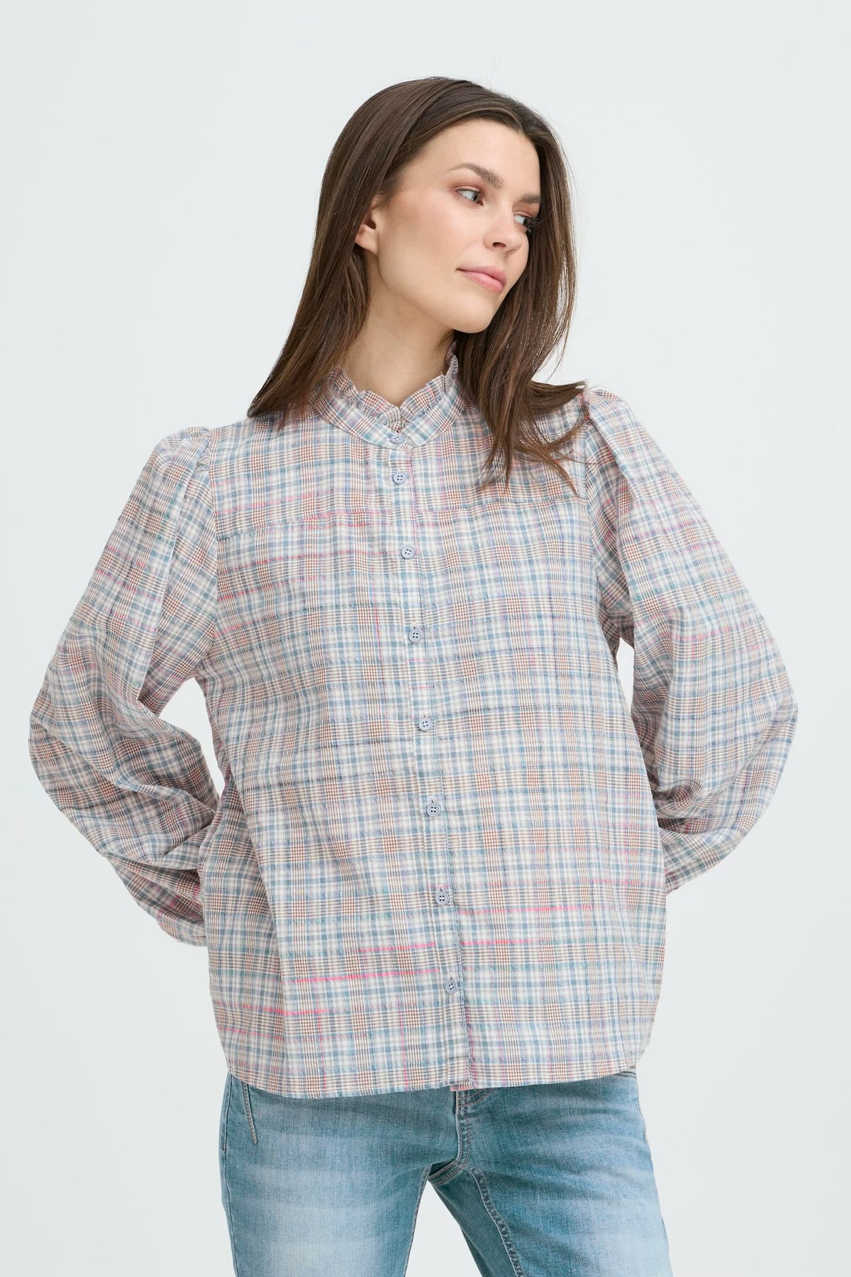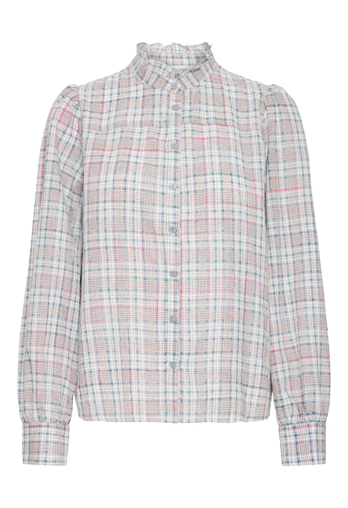 Plaid shirt with a structured finish, straight fit, and gathered shoulders. Features a high stand ruffle collar, front button placket, and full-length sleeves with button cuffs.