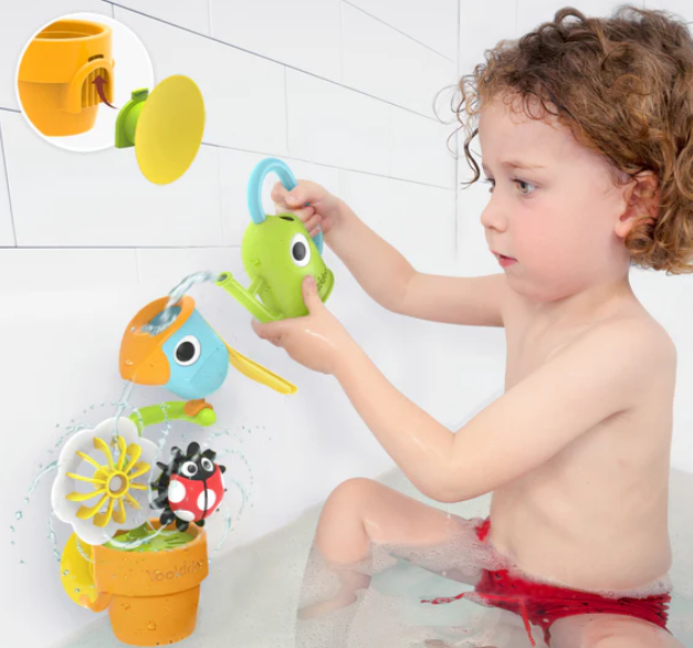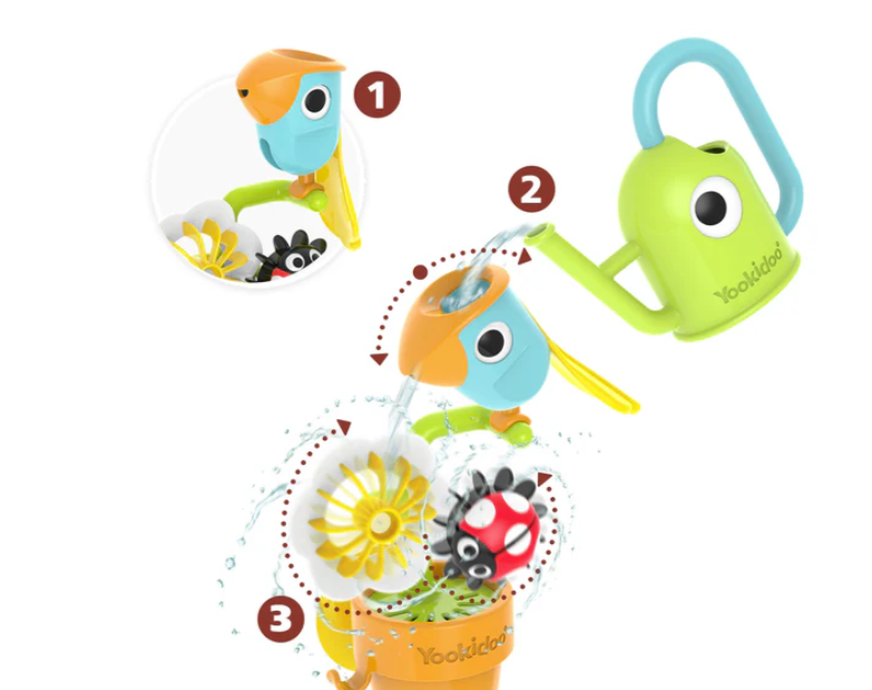 A garden themed bath toy- a flower pot with a tipping bird, spinning flower and ladybug. Also includes a watering can that can be used to water the bird at the top of the flower pot and set off a chain reaction of fun!