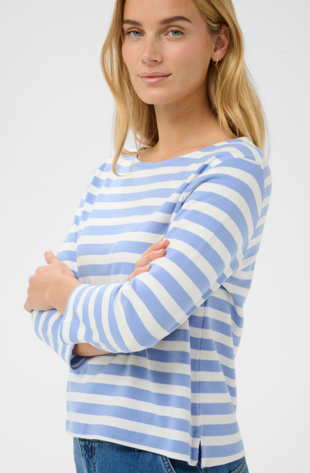 This striped T-shirt with 3/4 sleeves and a boat neckline offers a classic, maritime-inspired look. The slightly boxy fit makes it ideal for relaxed everyday wear – style it with jeans, shorts, or under a blazer for a clean and simple outfit.