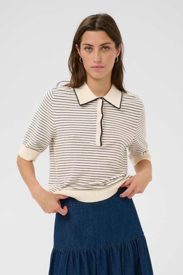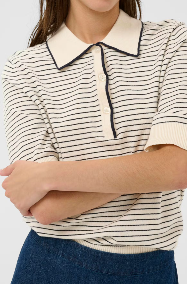 This short-sleeved knit polo features a fine striped pattern, classic collar and button placket with contrasting details. The soft knit quality offers a comfortable fit with a clean finish. Style it with denim or tailored trousers for an effortless, everyday look.