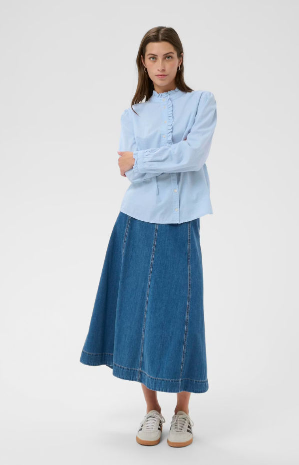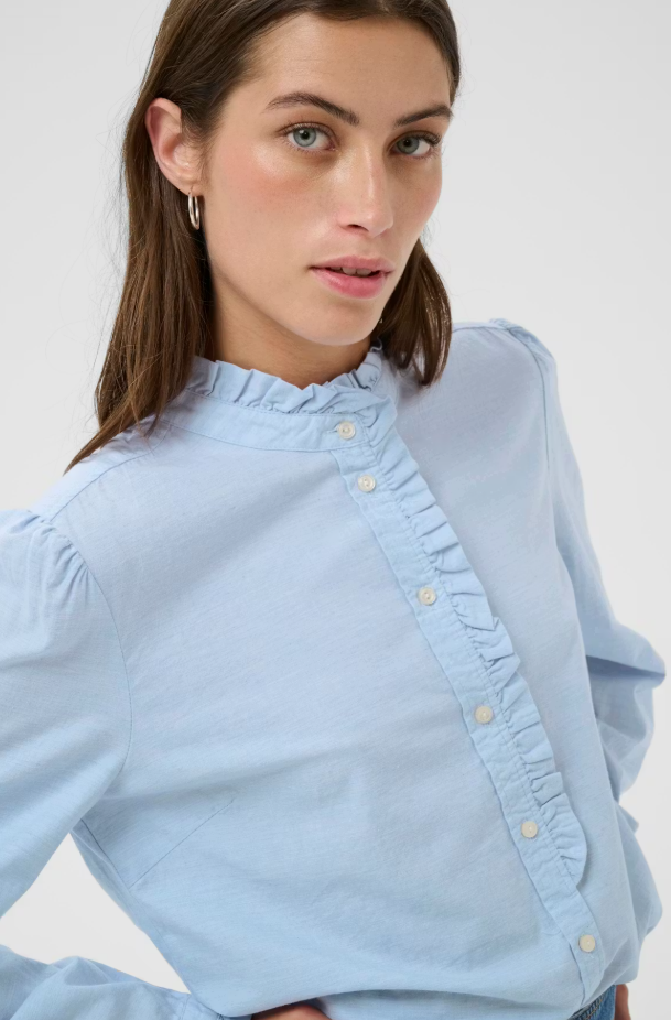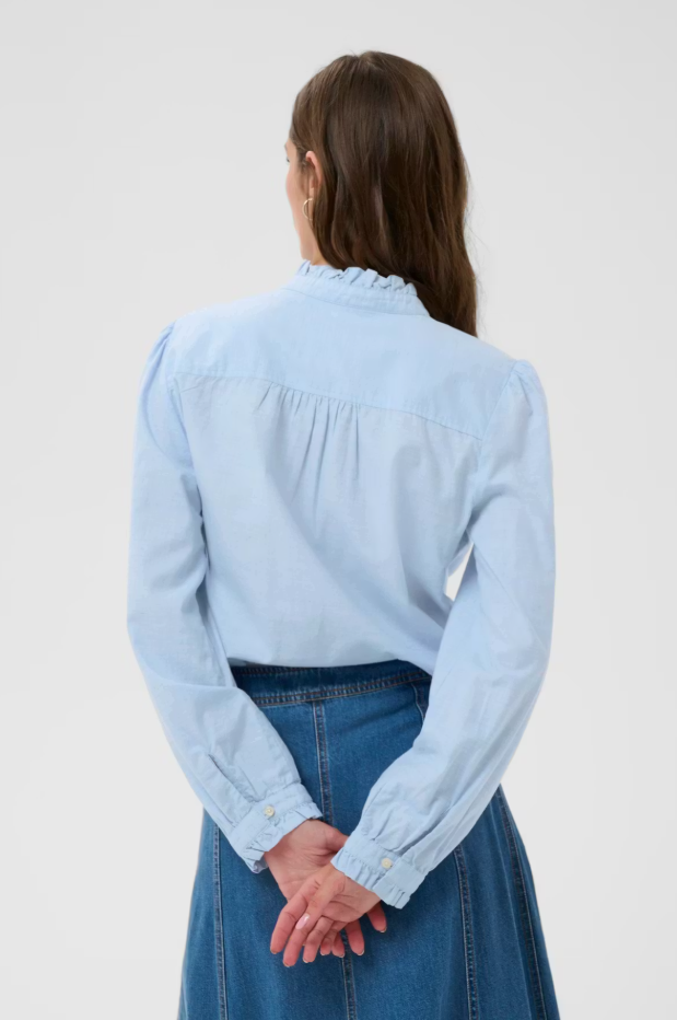 This light blue shirt is made from a soft cotton blend and features feminine details like ruffles along the button placket and neckline. With its classic fit and long sleeves, it's ideal for everyday wear or more formal occasions. Style it with denim for a relaxed look.