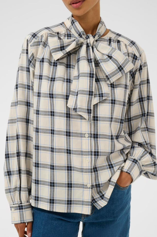 This checked shirt features feminine puffed sleeves and a detachable bow at the collar. Wear it open or buttoned – with or without the bow – and style it casually or dressed-up depending on the occasion.