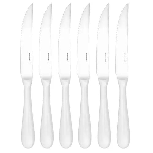 Polished to a sparkling mirror finish, each knife features a serrated blade for easy cutting.