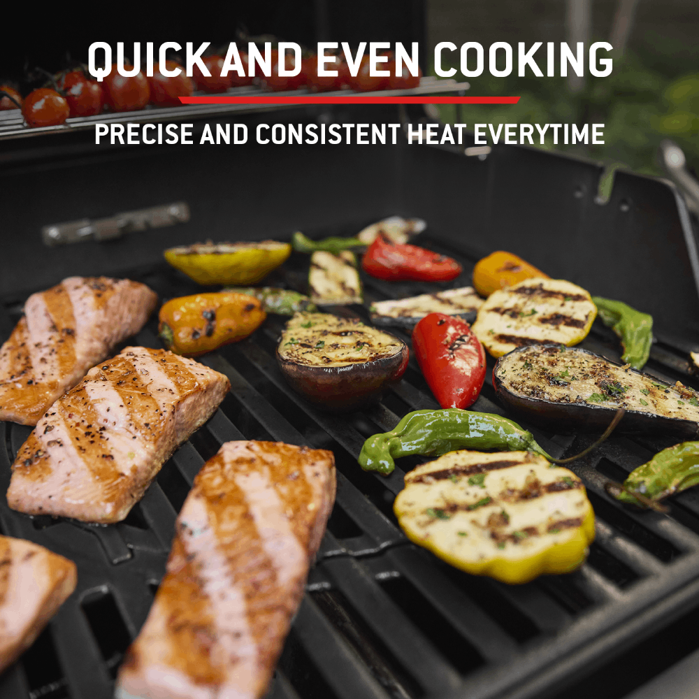 Aesthetically, it is a smart-looking bit of kit, featuring a sleek black enamel lid, a silver control panel, and a tidy enclosed cart that keeps your gas bottle tucked out of sight. Under the lid, Weber’s signature stainless steel Flavorizer Bars work in tandem with the high-grade cast iron cooking grates to ensure heat is spread evenly across the entire surface. This setup is perfect for direct grilling, ensuring that everything from the casual Saturday afternoon smash burger to a delicate fillet of fish is cooked to perfection every time.