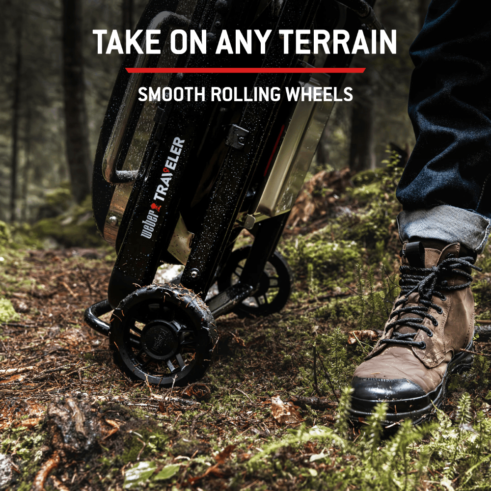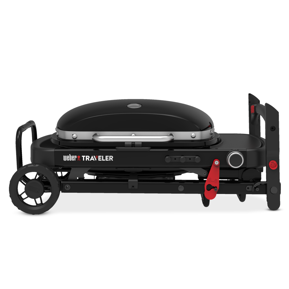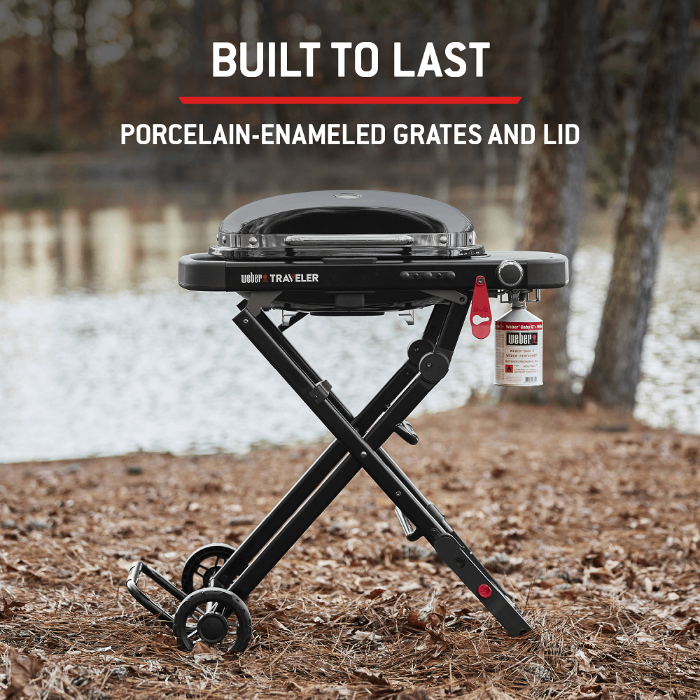 • This grill is weather-resistant, but we recommend using the Weber Premium Cover for Traveler Compact Portable Barbecues to protect against garden grime