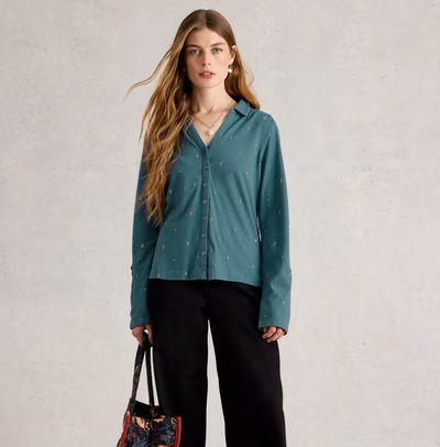 White Stuff Ladies ANNIE EMBROIDERED JERSEY COLLARED SHIRT in MID BLUE