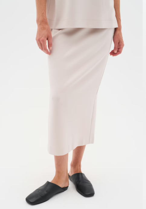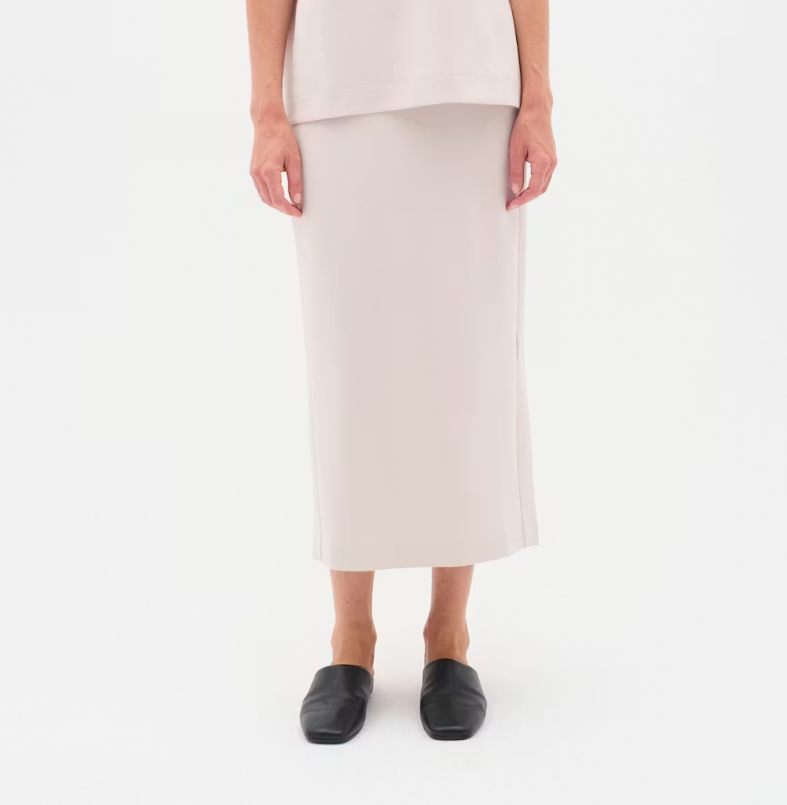 Light beige, knee-length skirt in a soft modal blend with a clean, elegant silhouette. It features a fitted shape, elasticated waist and back slit for ease of movement and a modern look. The model is 176 cm tall and wears size 36/S.
