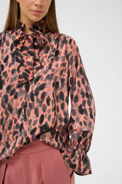 Blouse with statement animal print, high ruffled neck, and elegant tie detail. Features loose long sleeves with flared cuffs and straight silhouette.
