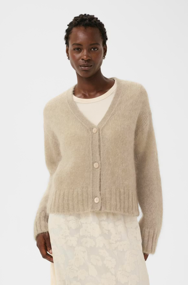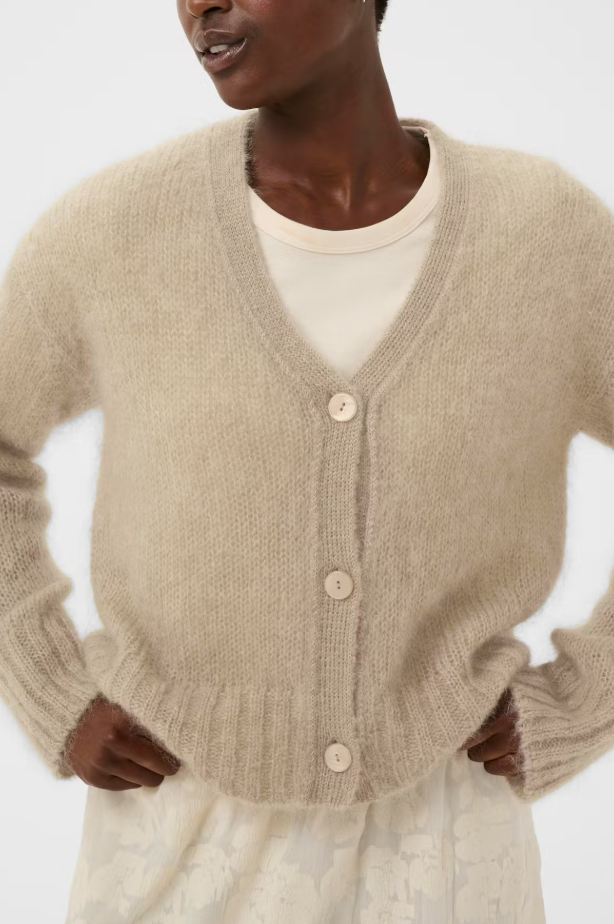 This soft wool-blend cardigan features a slightly fluffy texture and a simple look with a V-neckline and three front buttons. Its cropped length makes it easy to style over dresses or shirts – ideal for everyday layering.