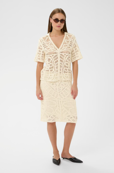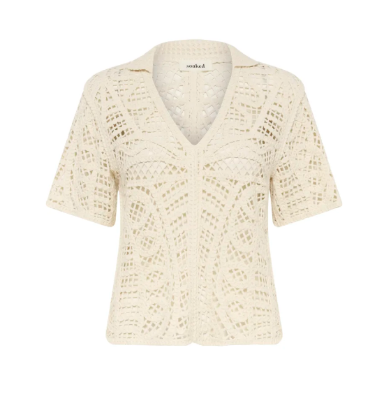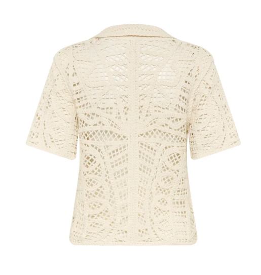 Crochet shirt features a straight fit, deep V-neckline, classic collar and elbow-length sleeves. Openwork texture and geometric pattern define this airy style