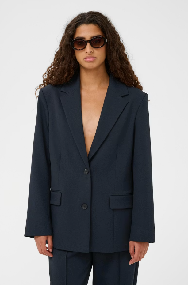Single-breasted blazer with structured straight fit, notch lapels and two-button closure. Features front flap pockets, long sleeves and tailored details for a clean, confident silhouette.