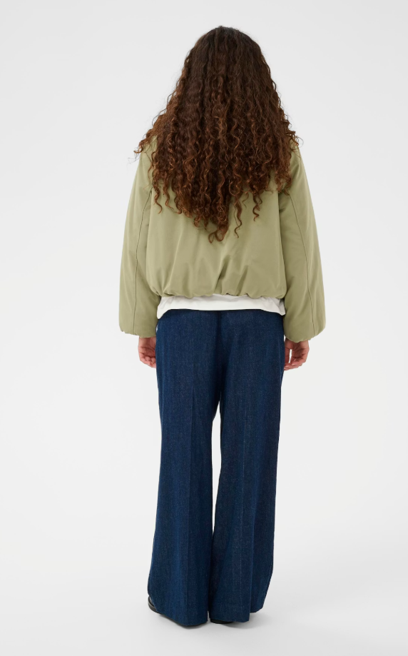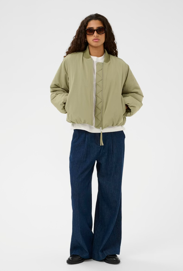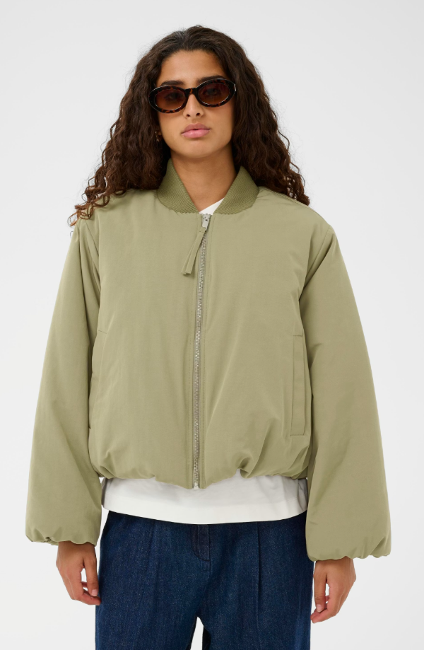 Bomber jacket with clean lines, relaxed boxy silhouette, ribbed stand collar, front zip closure and slanted flap pockets. Smooth surface finish defines its effortless appeal.